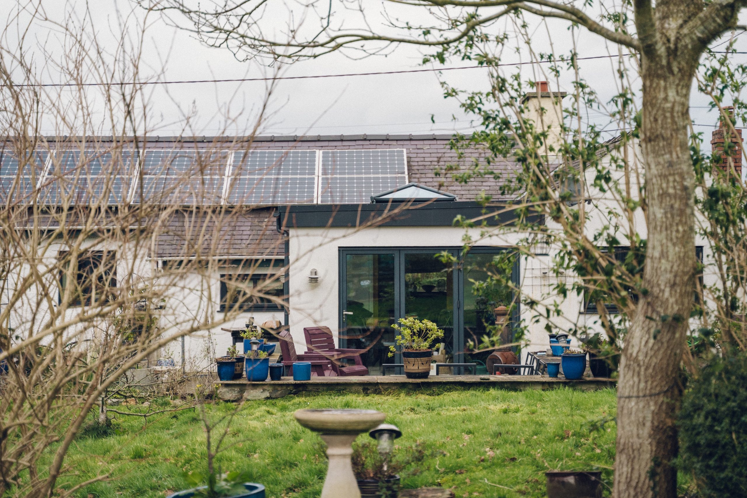 Byngalo eco arbennig gyda gardd ddeheuol tri chwarter erw, munudau o’r pentref. / Exceptional eco bungalow with three quarters of an acre south-facing garden, minutes from village.