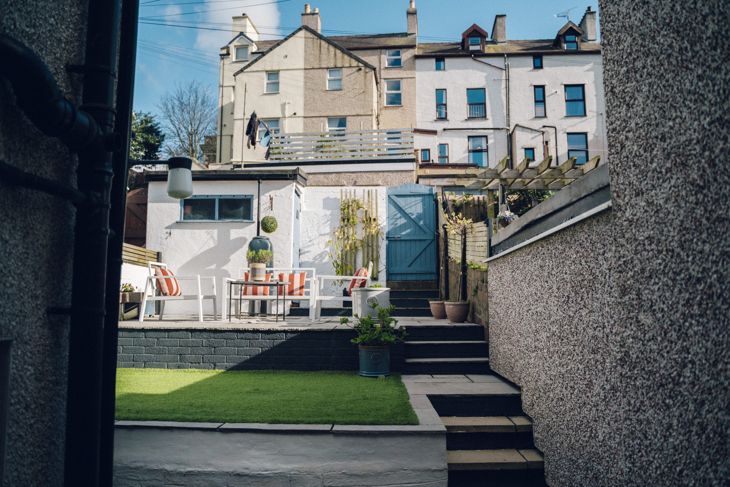 Er bod y gegin yn ‘compact’, mae’n cysylltu’n uniongyrchol â’r ardd – perffaith ar gyfer barbeciw haf neu ginio gyda ffrindiau, gyda mynediad cefn drwy giât sy’n ei gwneud hi’n hawdd dod i mewn ar ôl diwrnod allan.