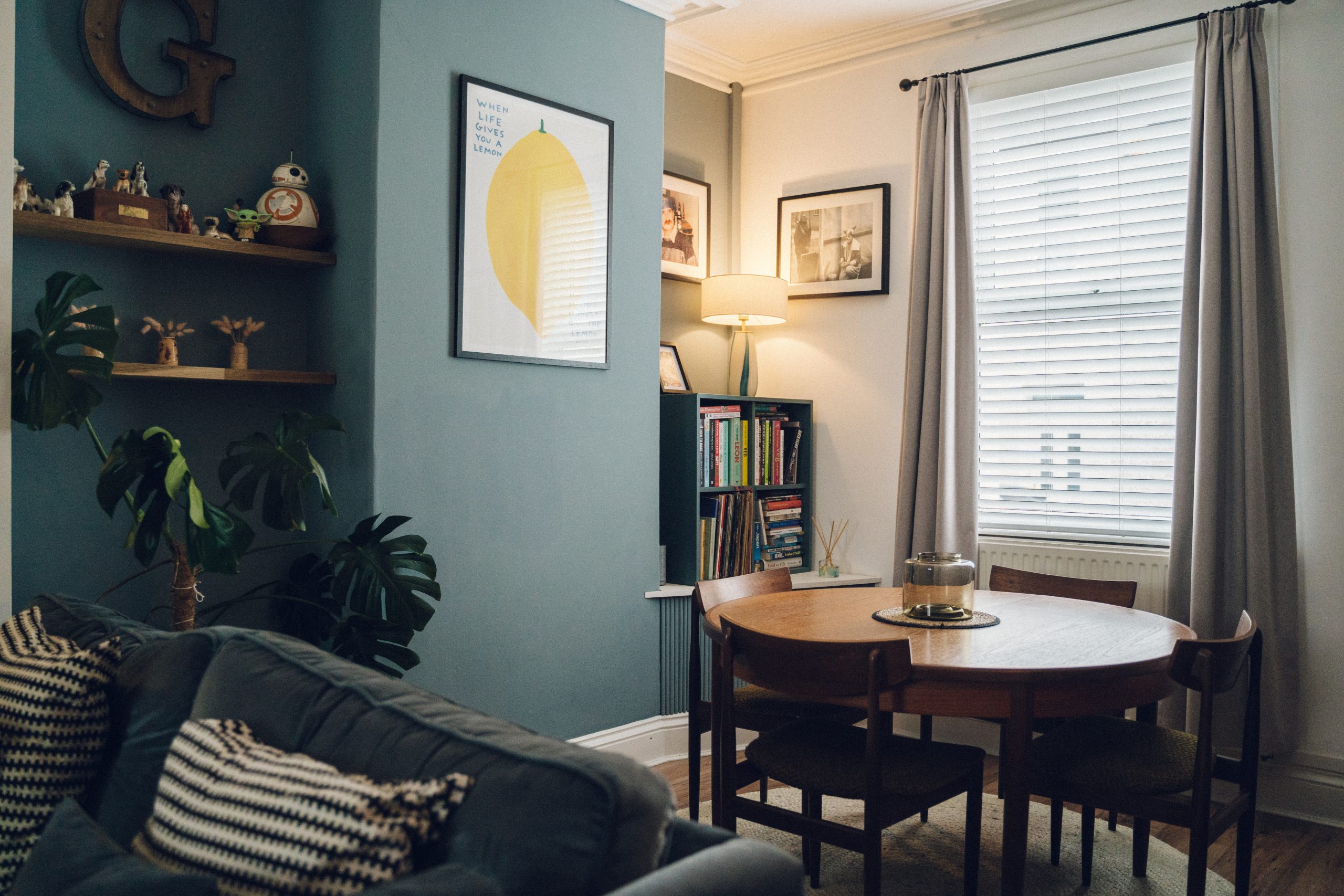 A dining area that flows from the living space yet feels nicely separate. A quirky, characterful spot, perfect for long evenings playing board games and listening to vinyl spinning in the background.