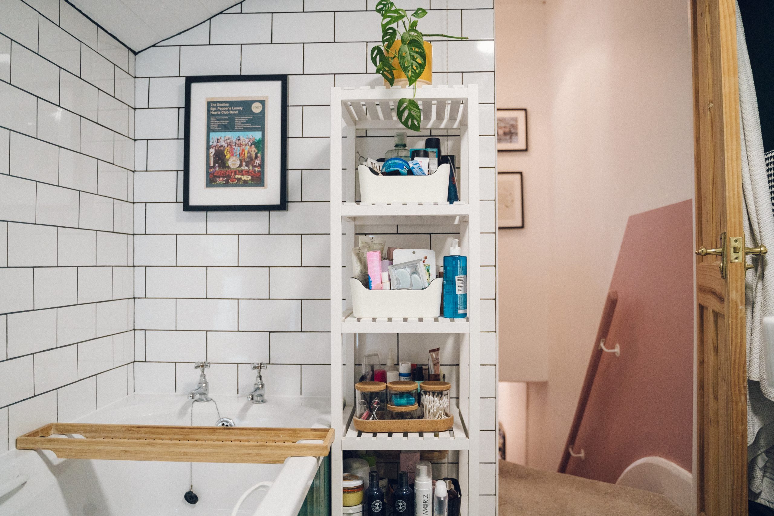 A bathroom at the top of the stairs that feels instantly calming as you step into it. It features a large standalone shower, a new towel rail and a separate bath – perfect for long, relaxing soaks and candles.